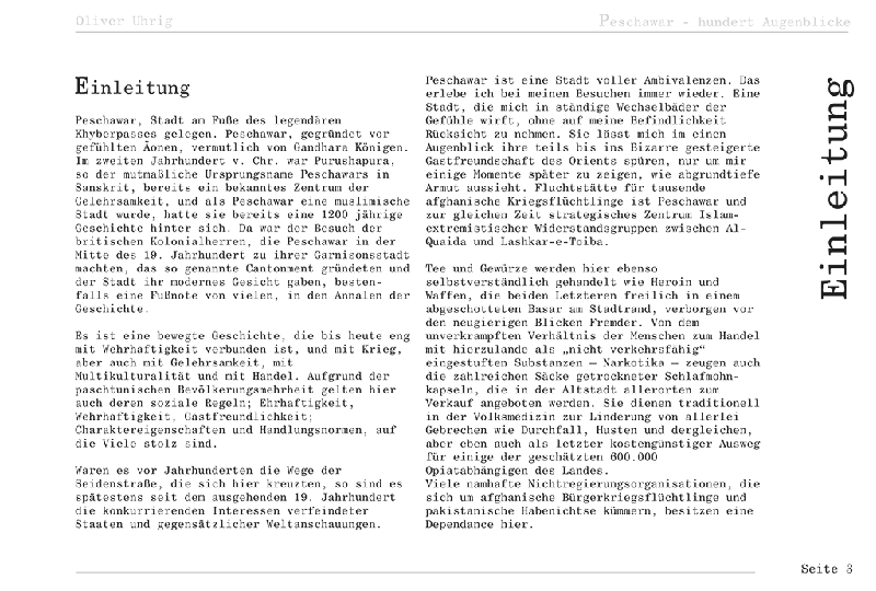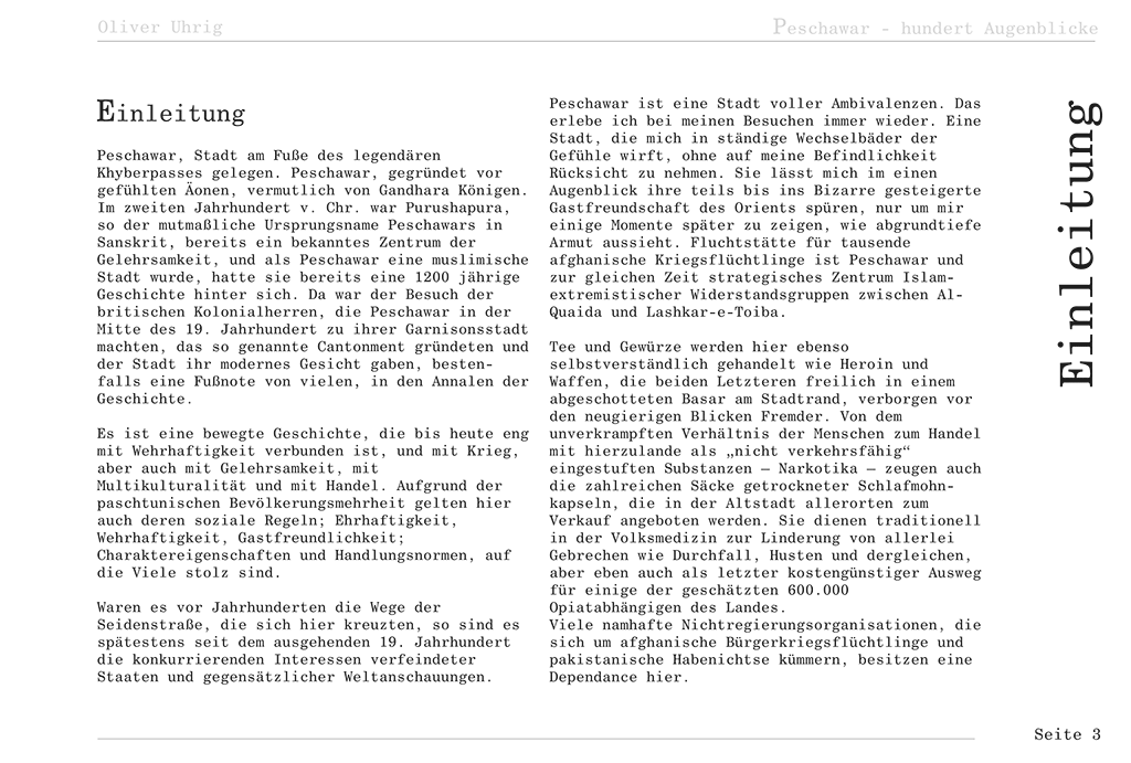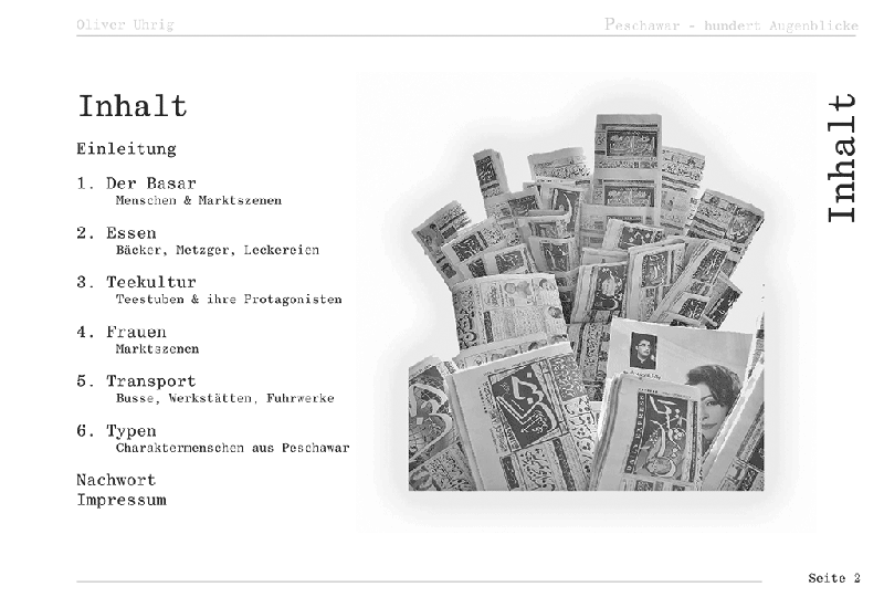 In dem vorliegenden Band aus dokumentarischen Menschenfotografien und erläuternden Texten finden sich Porträts ebenso wie Gruppenaufnahmen und Milieustudien. Sie alle erzählen uns etwas über den Alltag der Menschen, über ihr Leben und ihren Überlebenskampf - über die Identität von Peschawar.