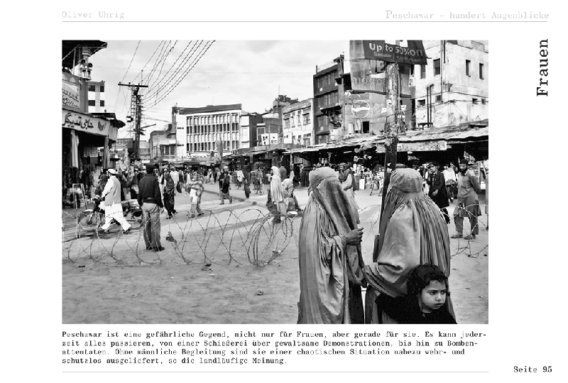 Peschawar hat jedoch auch ein anderes Gesicht.Nur allzu häufig reißen tückisch platzierte Bomben immer wieder Dutzende in den Tod; vor staatlichen Einrichtungen, in den Geschäfts- und Verwaltungsvierteln, und in den engen Gassen der Altstadt. Unter der Wucht der Explosionen, die mit der Geschwindigkeit eines Flugzeuges und der Vernichtungskraft des jüngsten Gerichtes durch die belebten Basare rasen, fallen Häuser in sich zusammen, werden Glasflaschen und Gewürzkisten zu tödlichen Geschossen, die ihr Ziel niemals verfehlen.